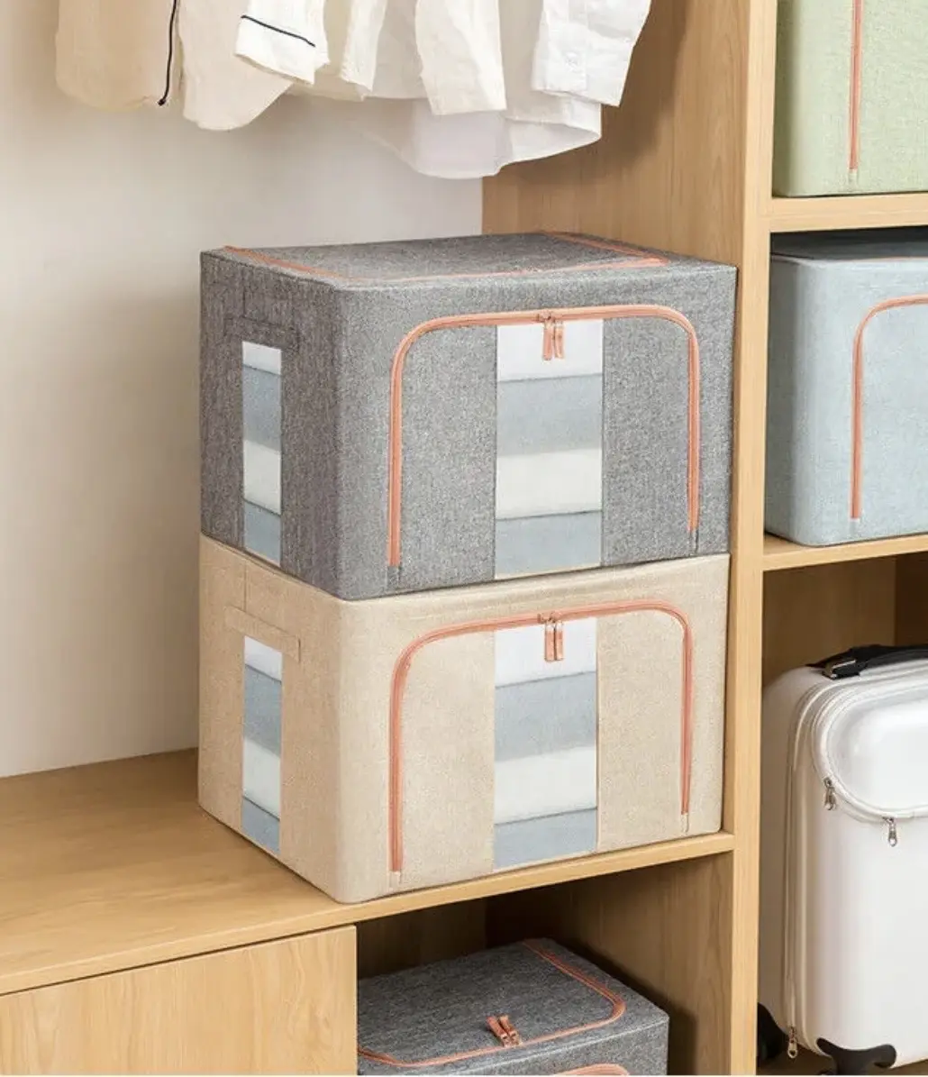 1 caja organizadora plegable con divisores y tapa con cierre.