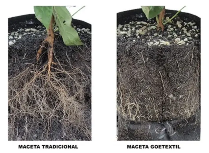 Las macetas geotextiles son porosas, lo que promueve el proceso de «air pruning» o poda aérea. Esto ocurre cuando las raíces tocan las paredes de la maceta, lo que hace que las raíces más finas se detengan y crezcan hacia nuevas direcciones. Esto resulta en un sistema radicular más denso y saludable.