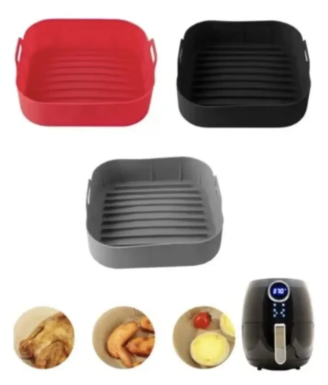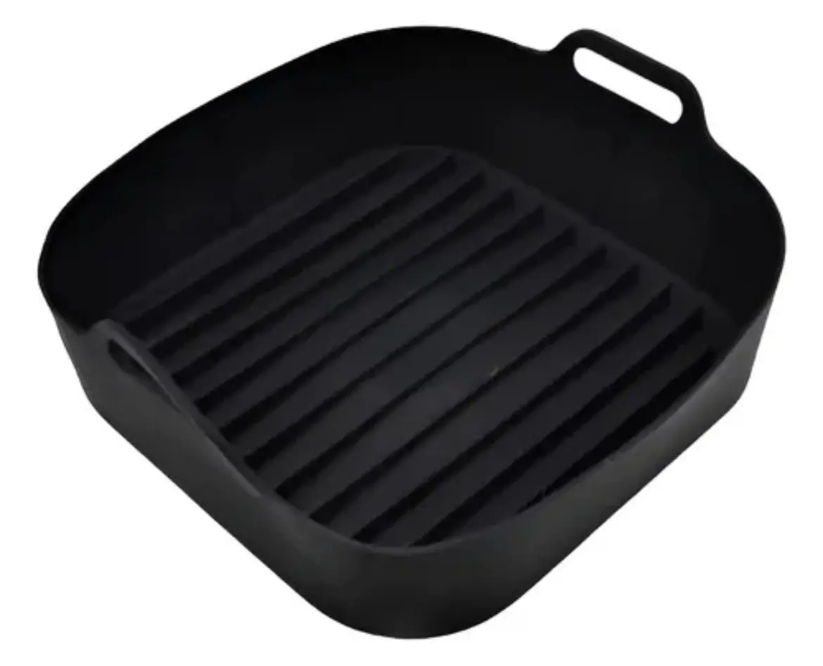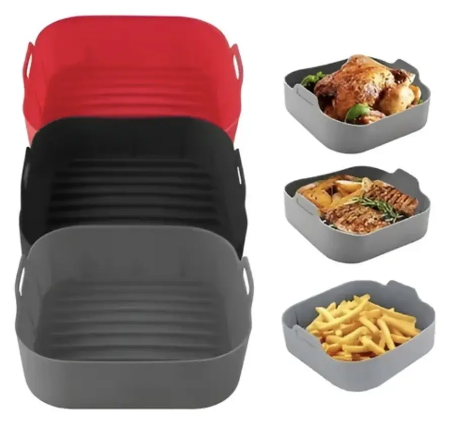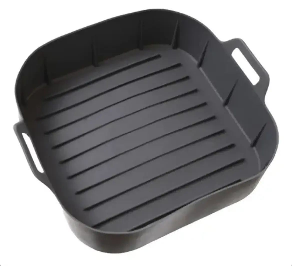 Este molde cuadrado de silicona es ideal para cocinar carnes, verduras, papas y mucho más en horno o freidora de aire. Su base con relieve tipo parrilla permite una cocción pareja y saludable, separando los alimentos de la grasa acumulada.