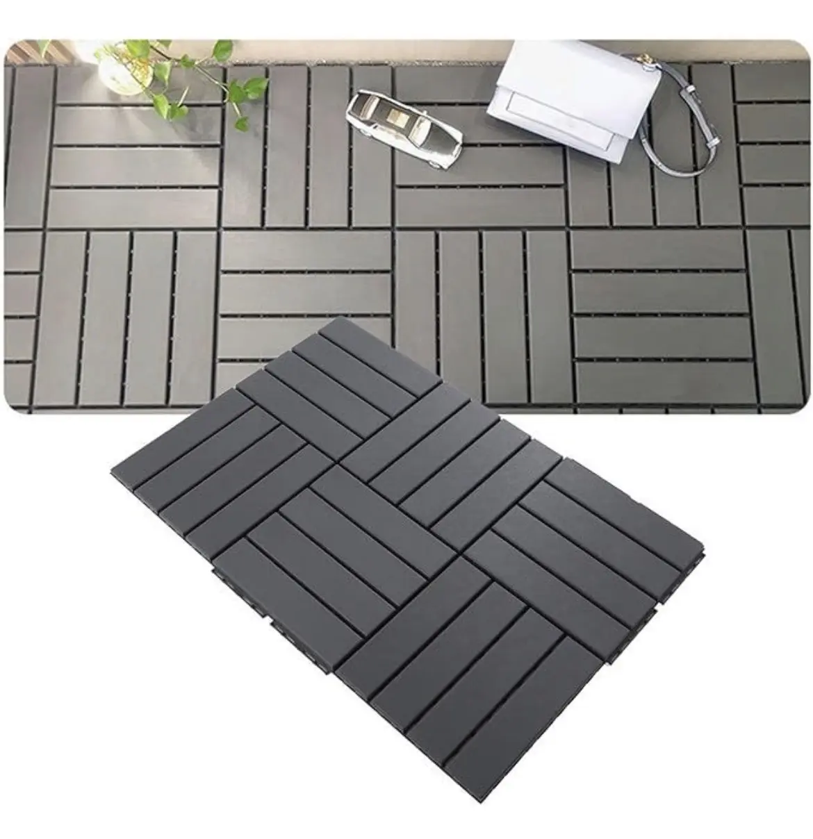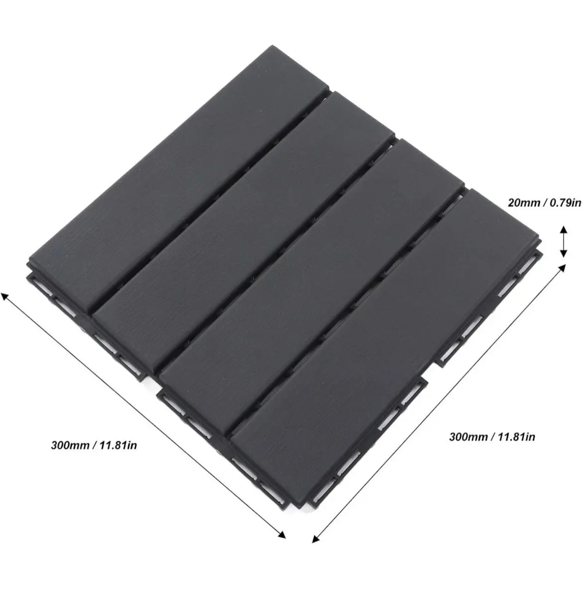 Descripción Piso baldosa de PVC estilo Deck encastrableMedidas: 30 x 30 cmEspesor: 2 cmColor gris oscuro