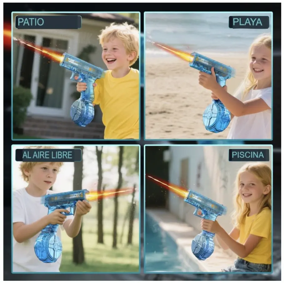 - Diseño Transparente: La pistola tiene un cuerpo de plástico transparente, permitiendo ver el mecanismo interno.